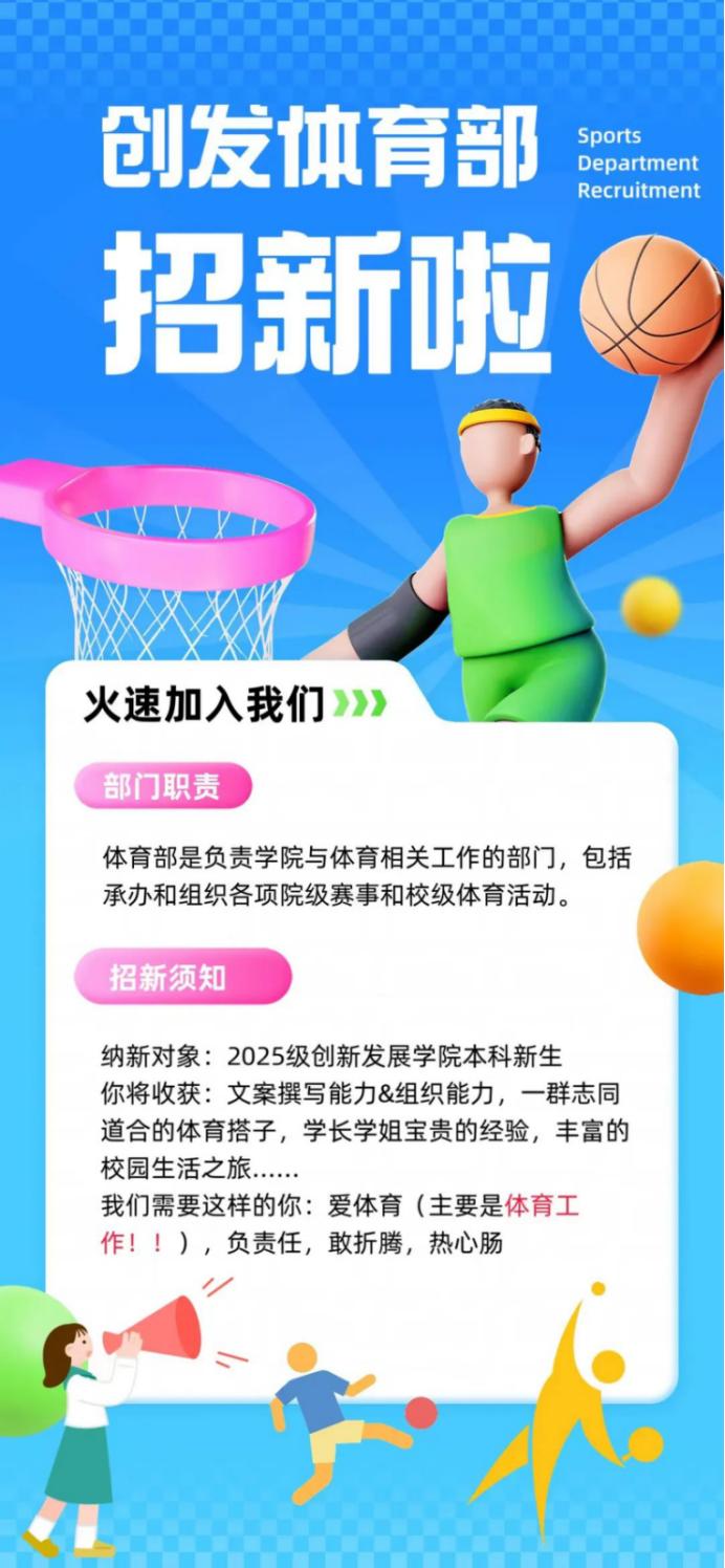 一见青新⑦ | 248cc永利集团学生会体育部等你来加入! 恭喜你刷到这篇——248cc永利集团学生会体育部2025招新特辑体育部拍一拍你快来加入我们!01我们的工作248cc永利集团学生会体育部是负责学院体育类活动的学生部门,包括组织和承办各项院级、校级体育活动,并为学院各院队提供服务。 我们组织参与新生运动会、春季运动会、消防运动会等,编排运动会方阵,组织寒假体育打卡活动,开展五四公益跑活动,并根据同学兴趣创新举办体育赛事:创发篮球院内赛与创发班级排球联赛,以及配合创...