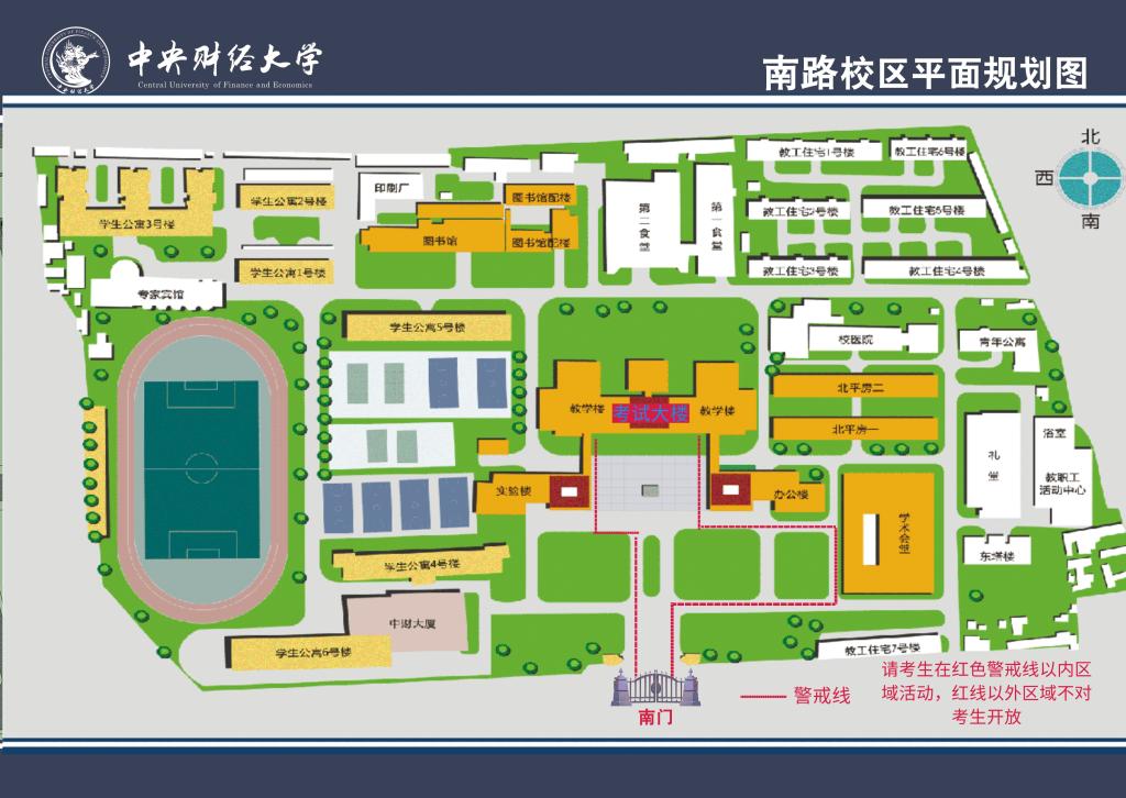 我校考试大楼设置在我校学院南路校区主教学楼,考场位置示意图见附件,我校考区内实行封闭管理,考区红框线外禁止考生进入。请考生根据本人准考证左下方的考场号,查看考场所在位置。每科考试结束后需尽快离场,勿要逗留。