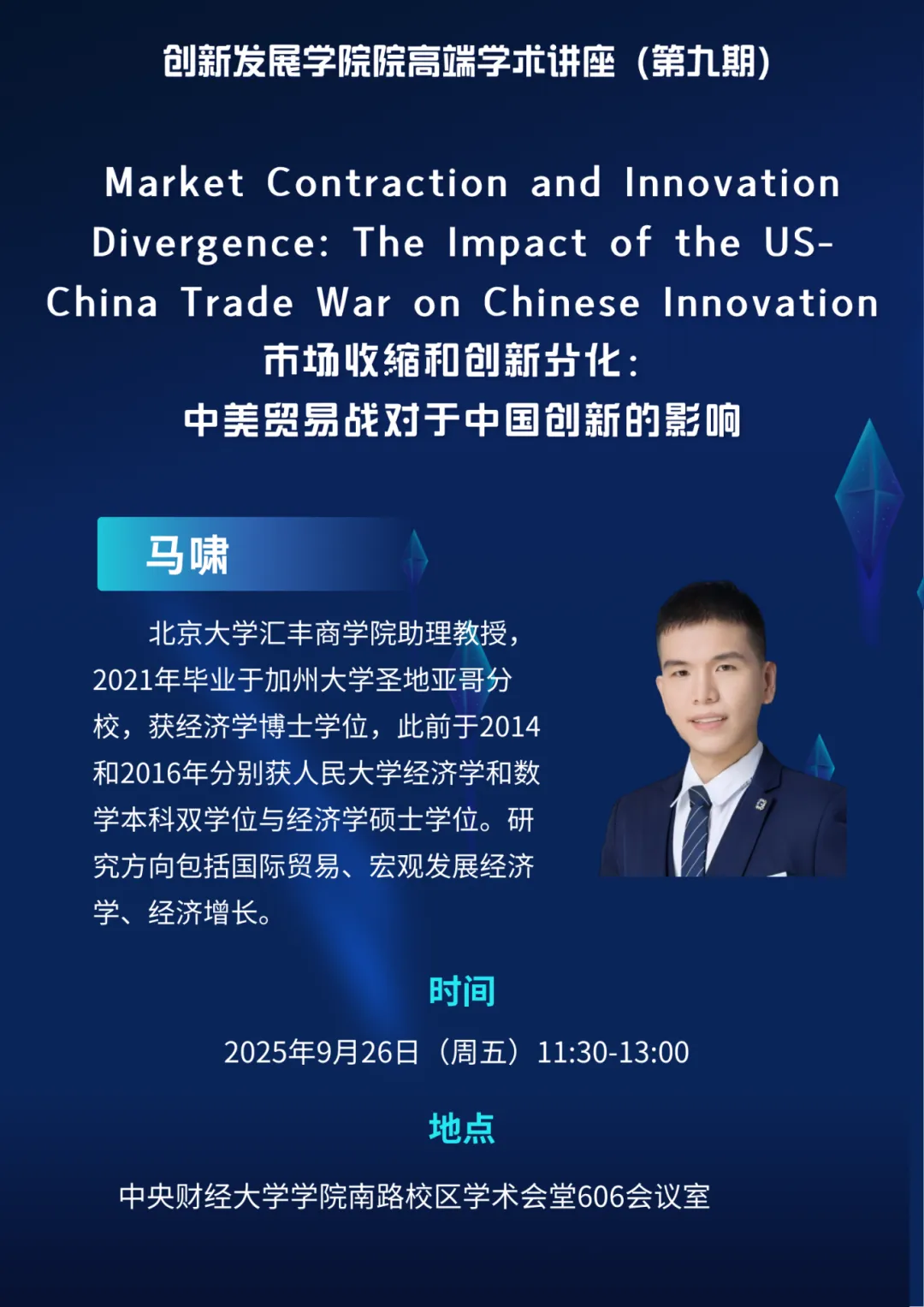 248cc永利集团高端学术讲座(第九期),理悦CEMA•知与行系列研讨会2025年第1讲将于9月26日(周五)11:30-13:00在学术会堂606会议室举行,由北京大学汇丰商学院的马啸老师报告“市场收缩和创新分化:中美贸易战对于中国创新的影响”,欢迎感兴趣的师生(尤其是对科研有兴趣的本科生、硕士生和博士生)参加。