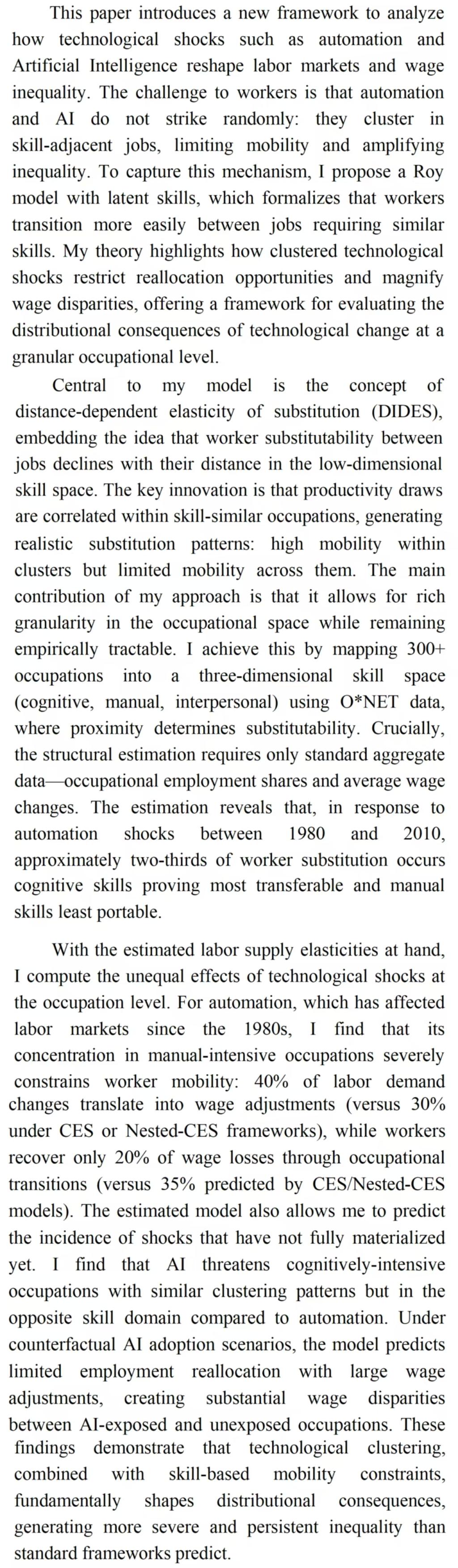 248cc永利集团高端学术讲座(第十二期),理悦CEMA•知与行系列研讨会2025年下学期第4讲将于10月15日(周三)中午12:00-13:30在学术会堂706会议室举行,由耶鲁大学经济学博士候选人范天宇报告他的独立作者的最前沿的AI和自动化的论文(jobmarket paper):“The Labor Market Incidence of New Technologies”(自动化和人工智能如何重塑劳动力市场和工资不平等)。欢迎广大师生(尤其是对科研有兴趣和追求的本科生、硕士生和博士生)参加。