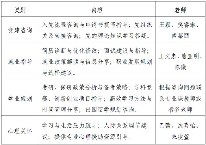 注:根据学生咨询情况及老师时间统筹安排,如有疑问或有特别指定老师,请联系闫老师(办公电话62288376)。
