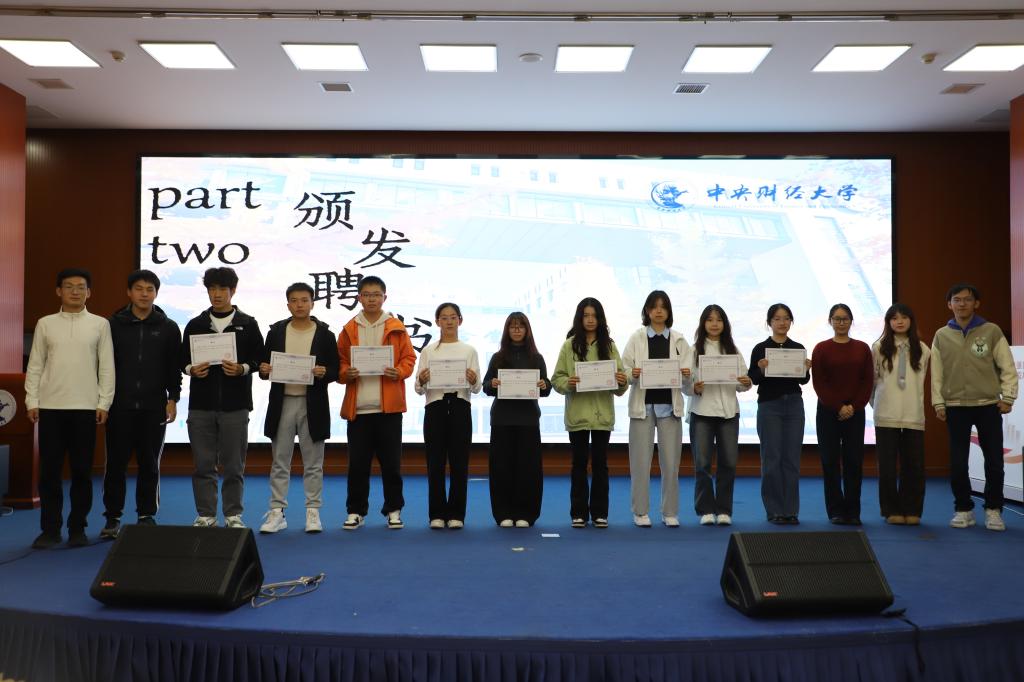 巴蕾老师、柴新凯老师、沈嘉怡老师为团委学生副书记、学生会主席团和新闻中心主任、副主任颁发聘书;随后,学生会主席团、团委学生副书记和新闻中心副主任为各部门负责人颁发聘书。最后,各部门负责人为所在部门干事颁发聘书。
