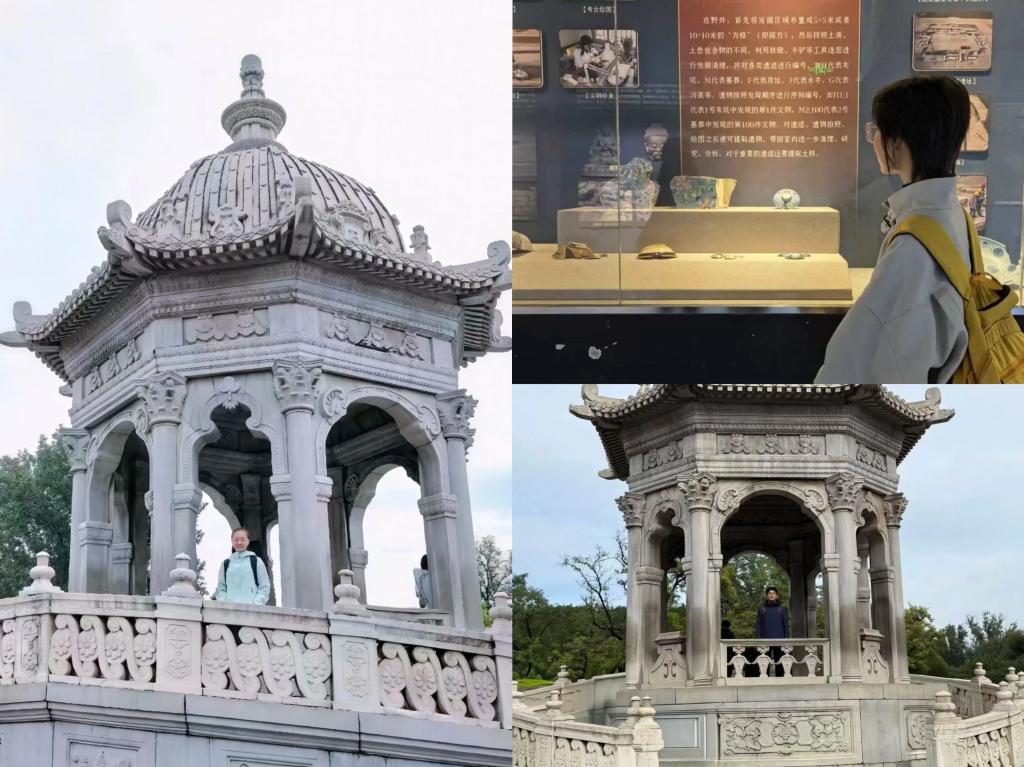 默哀仪式结束后,团员们分组有序参观远瀛观、黄花阵、观水法等遗址,驻足残破构件前研读铭牌介绍,交流历史背景与感悟。各组先后前往圆明园展览馆,通过详实的历史图片、精准的盛景模型及珍贵文物,系统了解圆明园从营建鼎盛到历经劫难、再到当代保护的沧桑巨变。马首铜像、翻尾石鱼等文物所承载的家国记忆,让团员们对文明传承与民族复兴有了更真切的体悟。